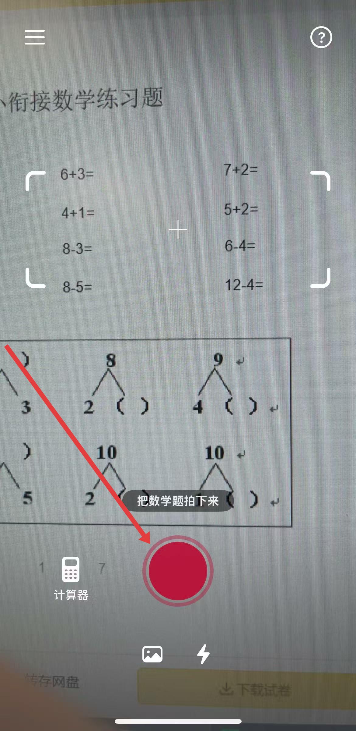 3、設(shè)置完后返回主界面,將攝像頭對準(zhǔn)數(shù)學(xué)題目,點擊紅色拍攝按鈕獲取題目答案。