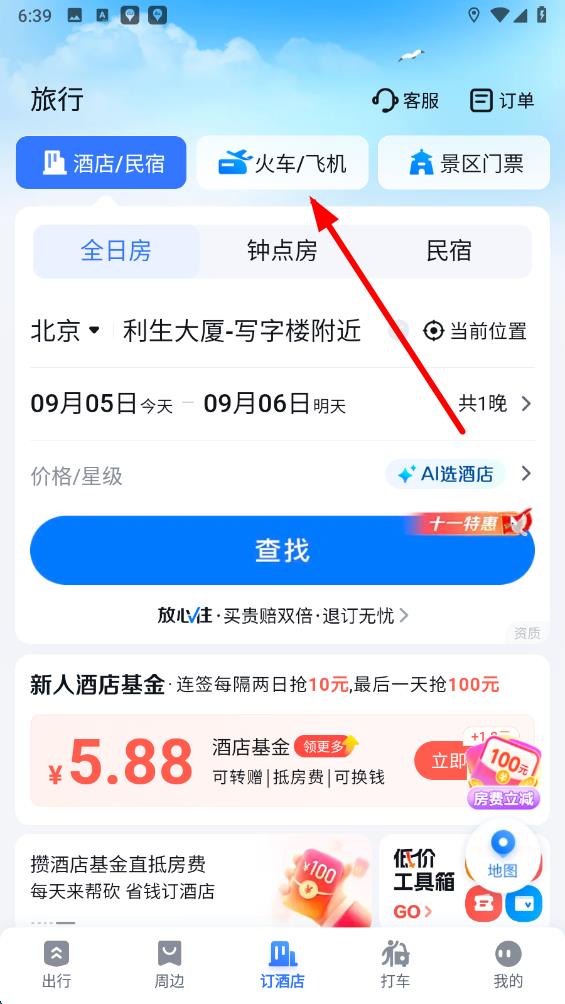 2、在旅行服務(wù)界面中,找到并點擊火車飛機按鈕,切換到火車票及飛機票預(yù)訂的頁面。