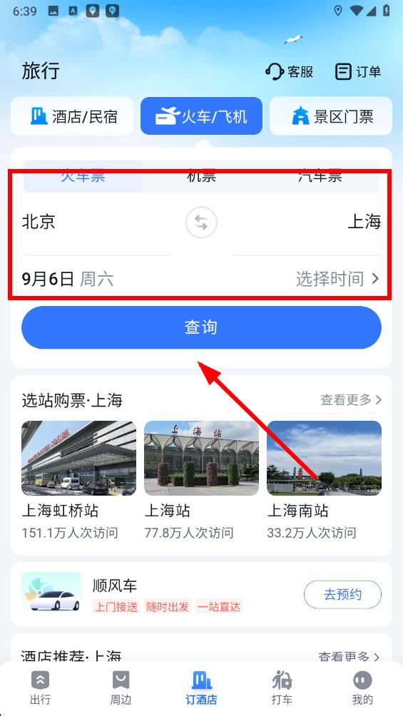 3、在火車飛機預(yù)訂頁面,選擇火車票選項,輸入出發(fā)地、目的地以及出行日期等信息,然后點擊查詢按鈕。