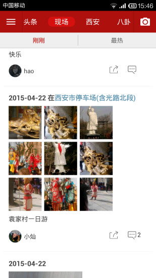 現(xiàn)場(chǎng):記者及用戶對(duì)身邊事件和資訊的第一時(shí)間發(fā)布、上傳