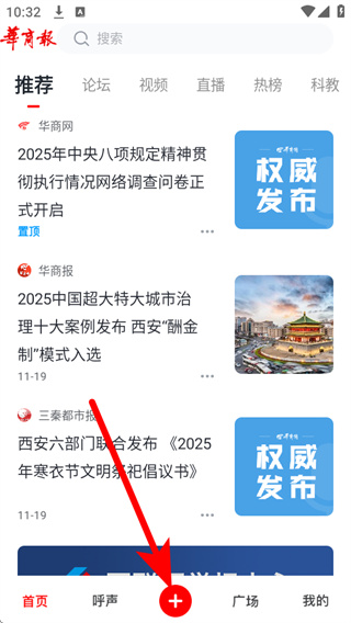 1、打開華商頭條APP,點(diǎn)擊底部的加號(hào)按鈕。