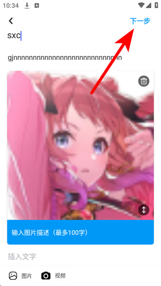 3、在美文發(fā)布頁(yè)面輸入內(nèi)容、插入圖片后,點(diǎn)擊右上角的下一步按鈕。