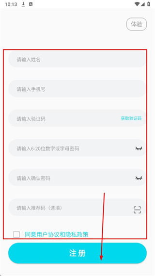 3、輸入姓名、手機(jī)號(hào)、驗(yàn)證碼,設(shè)置密碼并確認(rèn),勾選協(xié)議,然后點(diǎn)擊注冊(cè)。