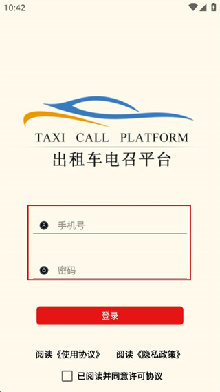 1、在個人信息保護指引界面點擊同意并繼續(xù),進入出租車電召平臺登錄界面。