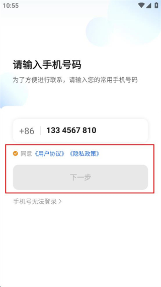 2、勾選同意用戶協(xié)議和隱私政策選項,等待下一步按鈕激活,以便進入后續(xù)驗證環(huán)節(jié)。