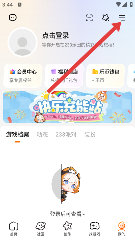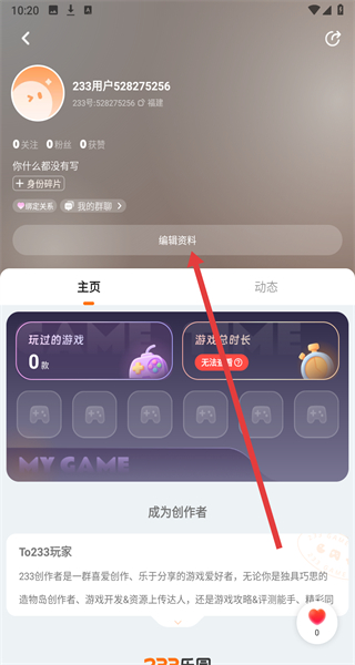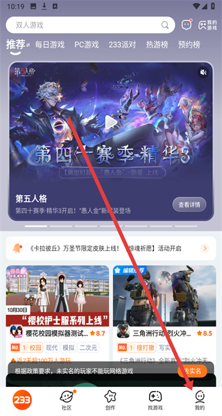 1、在233樂(lè)園首頁(yè)中,點(diǎn)擊右下角我的按鈕,進(jìn)入我的主頁(yè)。