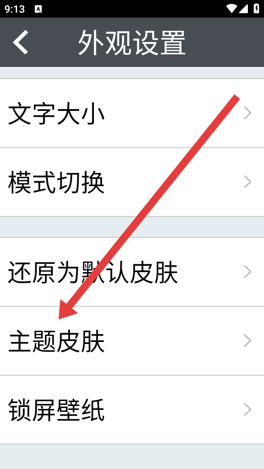 3、在外觀設(shè)置頁面,點擊主題皮膚的選項,進入主題皮膚選擇頁面。