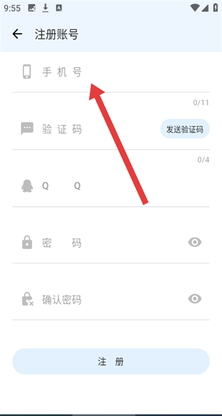 4、在注冊(cè)賬號(hào)頁(yè)面輸入手機(jī)號(hào),點(diǎn)擊“發(fā)送驗(yàn)證碼”并輸入,設(shè)置密碼和確認(rèn)密碼,點(diǎn)擊“注冊(cè)”,完成賬號(hào)注冊(cè)操作。