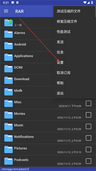 2、找到“設置”選項并點擊,進入RAR的設置頁面。