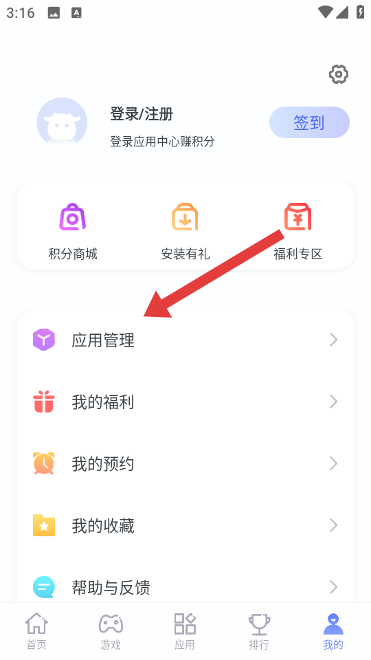 1、在紅魔應(yīng)用中心的我的頁面,點擊應(yīng)用管理選項,進入應(yīng)用管理界面。