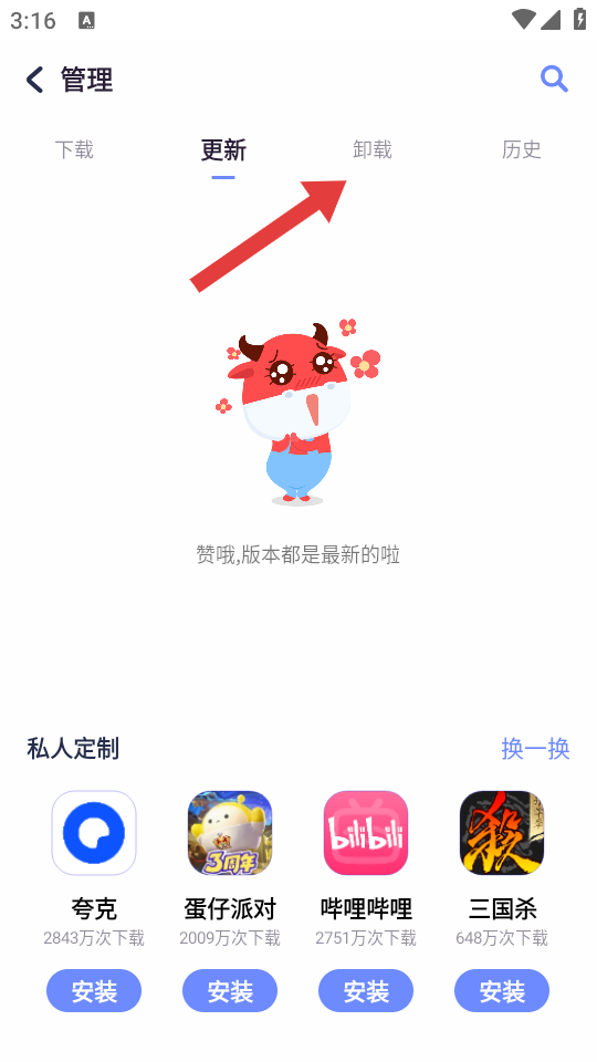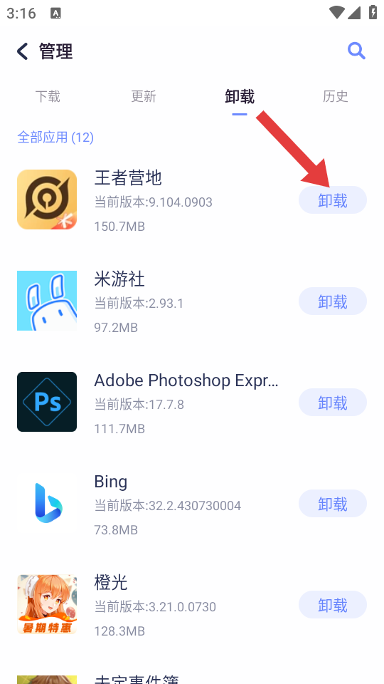 2、在應(yīng)用管理界面,點擊頂部的卸載標(biāo)簽,切換到卸載頁面。