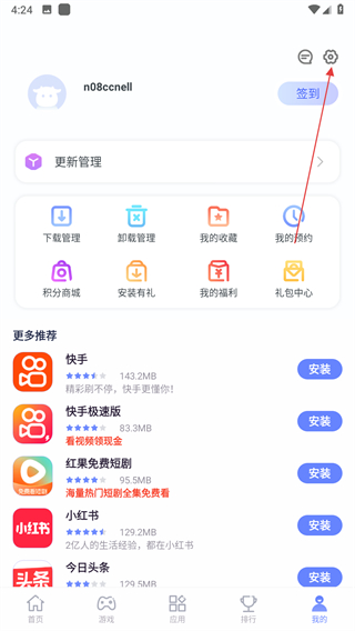 1、打開紅魔應(yīng)用中心,進入個人頁面,點擊右上角的設(shè)置圖標(biāo)。