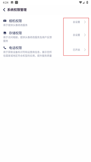 4、可對各個權(quán)限進行管理,點擊右側(cè)的去設(shè)置或已開啟按鈕即可。