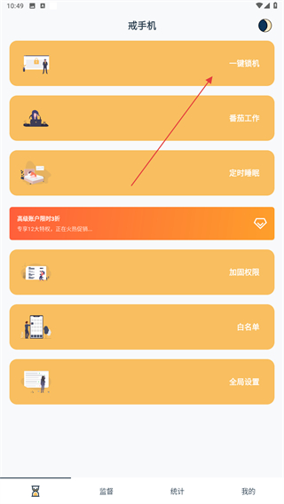 1、打開戒手機(jī)app,進(jìn)入到首頁內(nèi)點(diǎn)擊一鍵鎖機(jī)的按鈕。