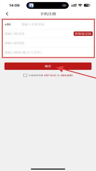 4、在手機(jī)注冊的頁面內(nèi),輸入手機(jī)號、驗證碼、密碼以及昵稱,再點(diǎn)擊確定的按鈕即可注冊成功。