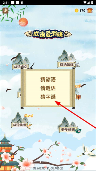 2、在趣味玩法選擇界面中,點(diǎn)擊猜字謎選項(xiàng),進(jìn)入猜字謎關(guān)卡界面。