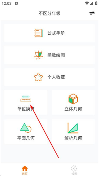 1、打開數(shù)學(xué)公式手冊app,在首頁點(diǎn)擊單位換算選項(xiàng)。