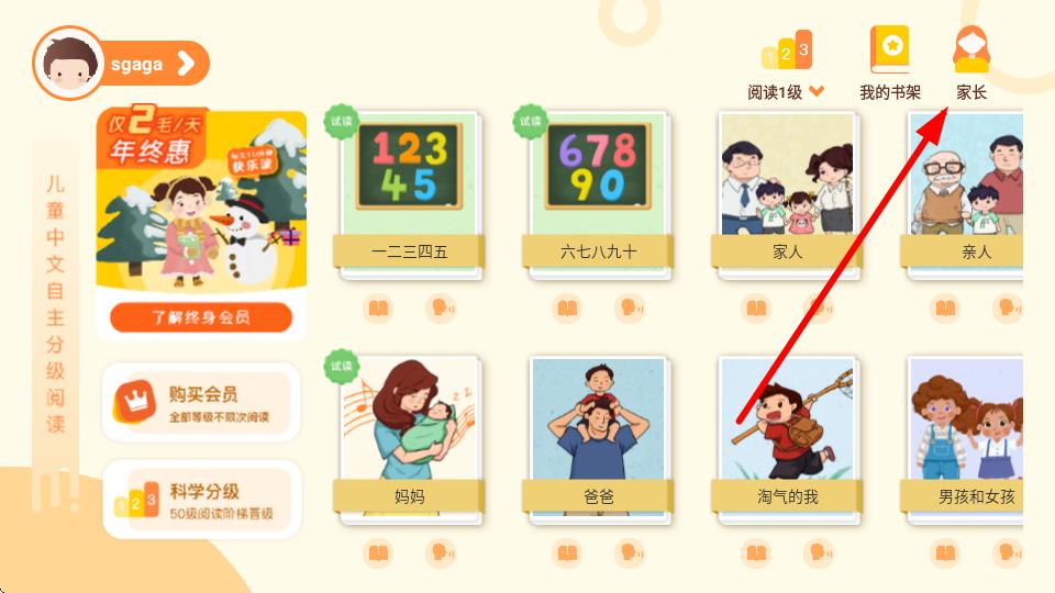 1、打開竹子閱讀app,進(jìn)入主界面后,點(diǎn)擊家長(zhǎng)選項(xiàng)進(jìn)入家長(zhǎng)中心。