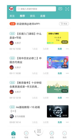 At老師APP是一款借助完整的技術平臺提供各種爆款課程視頻、名師直播互動式教學、一對一課程等進行知識共享,服務于全民的學習教育類應用軟件.At老師始終堅持"寓教于樂"的核心思想,提供豐富的生動、幽默、有趣的專業(yè)性課程內(nèi)容,橫跨升學學習、生活文娛、生活技能、興趣愛好多個領域,足不出戶即可瀏覽學習所有感興趣的內(nèi)容,讓學習不再枯燥!