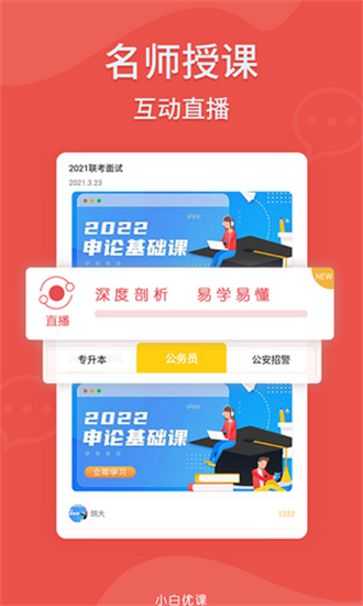 小白優(yōu)課是服務(wù)于公考方向人群的在線輔導(dǎo)平臺,它包含了公務(wù)員、公安招警、專升本等方向的專業(yè)課程,助力你完成學(xué)習(xí)內(nèi)容,更有每日訓(xùn)練題庫等你來完成,同時還有按照章節(jié)路線來學(xué)習(xí),全方位打通學(xué)習(xí)死角,努力學(xué)習(xí),讓公考無壓力,想要上岸嗎,快來下載吧!