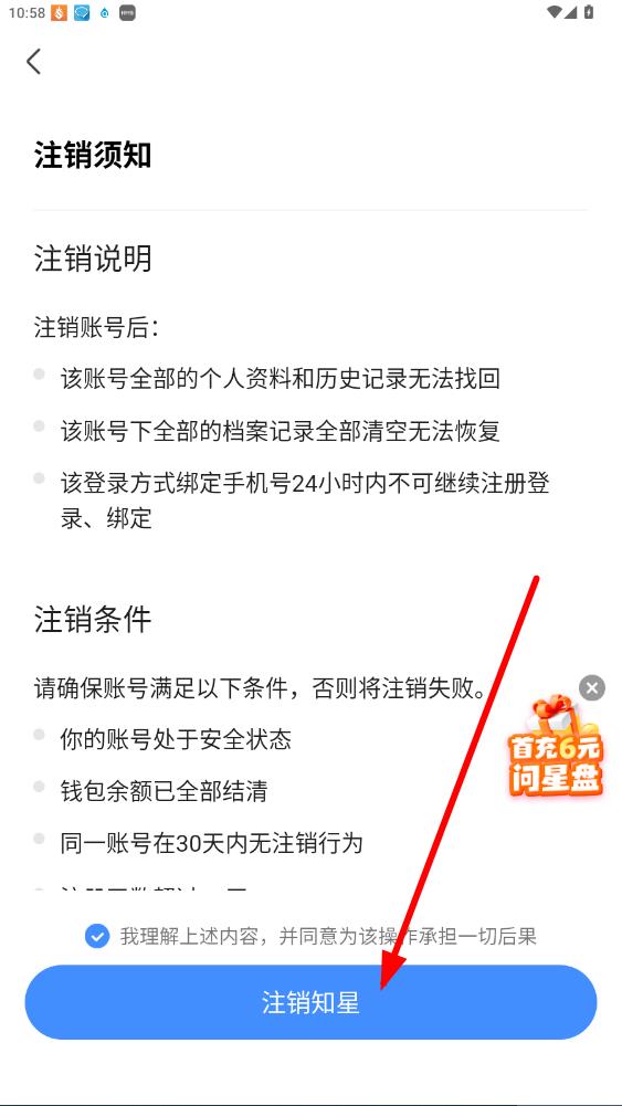 3、仔細閱讀注銷須知,勾選我理解上述內(nèi)容,并同意為該操作承擔(dān)一切后果,然后點擊注銷知星。