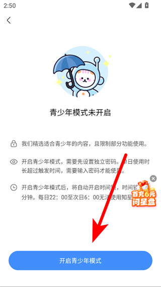 3、在青少年模式說明頁面點擊開啟青少年模式,進入設(shè)置密碼頁面。