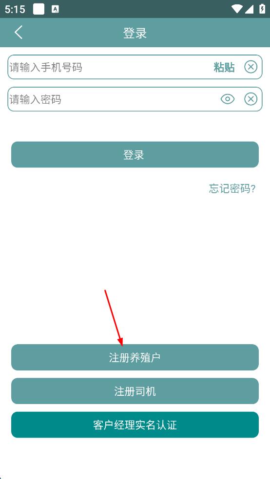 2、在APP主界面,點擊右下角“未登錄”,進入登錄頁面,點擊注冊養(yǎng)殖戶或根據(jù)自身身份選擇注冊司機等,進入注冊須知頁面。