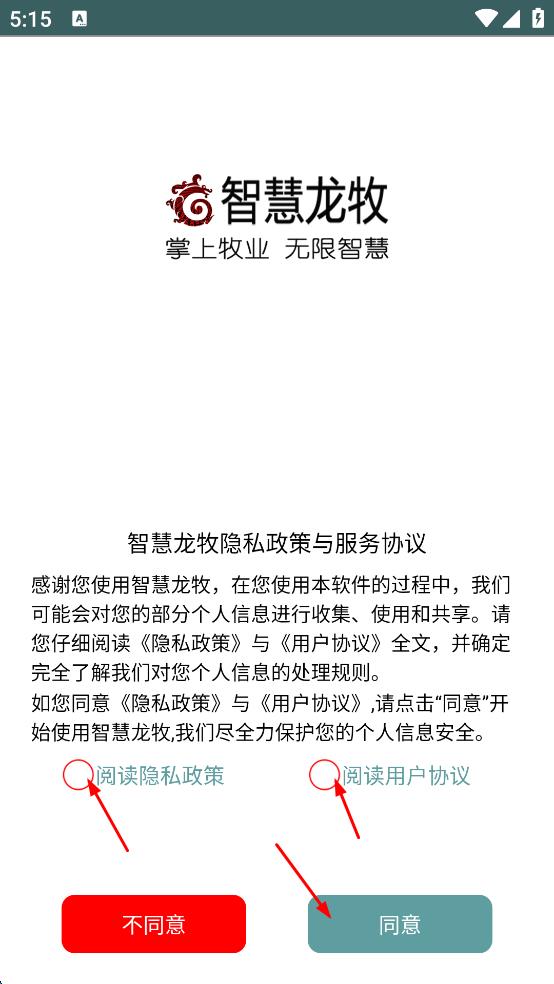 1、打開智慧龍牧APP,在隱私政策與服務協(xié)議頁面,勾選閱讀隱私政策和閱讀用戶協(xié)議,然后點擊同意,進入APP主界面。
