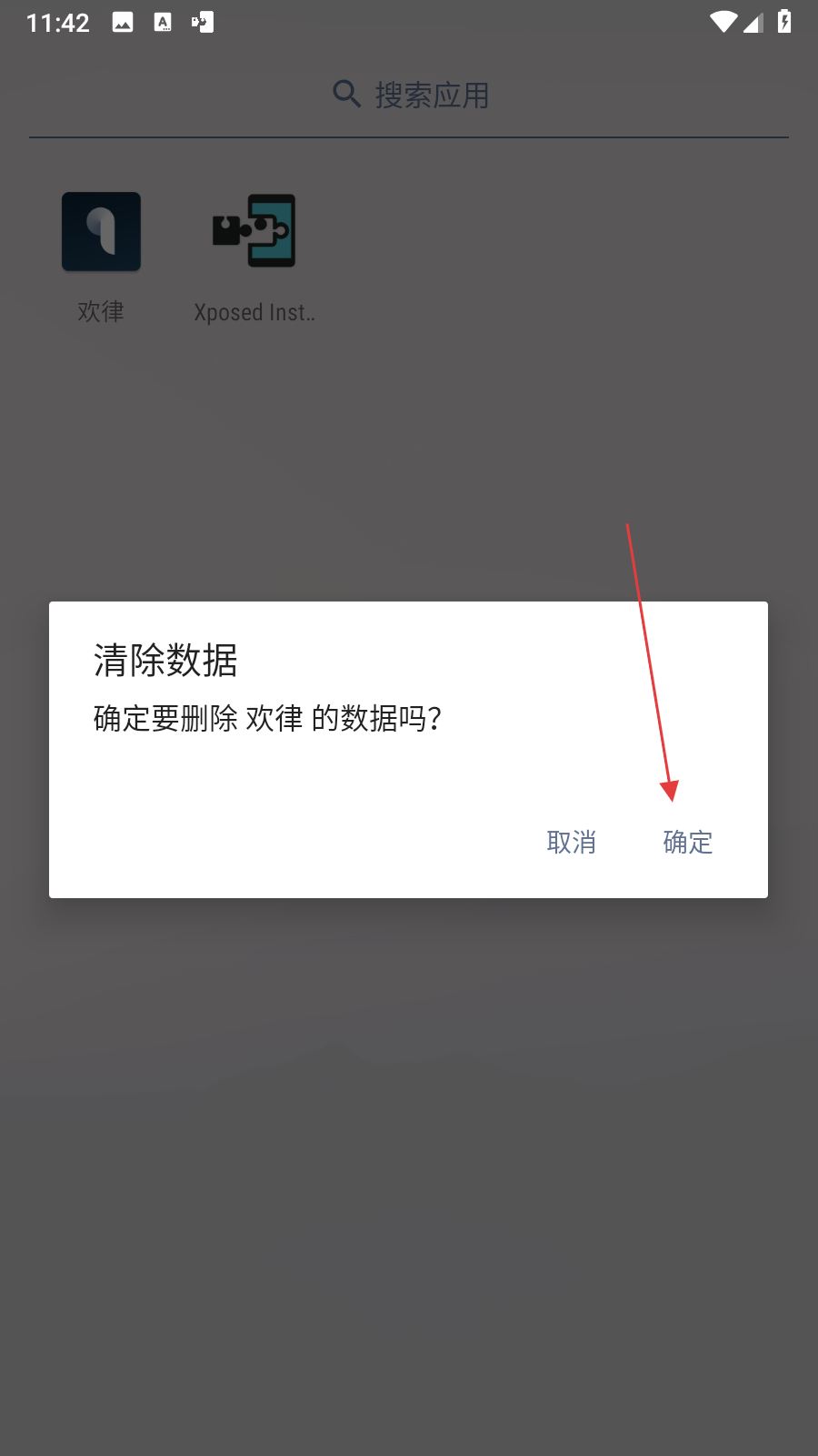 4、在彈出的清除數據確認對話框中,點擊確定按鈕,即可清除該應用在VirtualXposed虛擬環(huán)境中的數據。