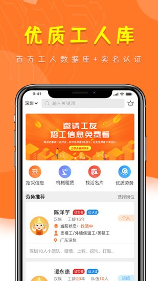 自動定位,智能推薦附近的優(yōu)質(zhì)勞務、工友名片。