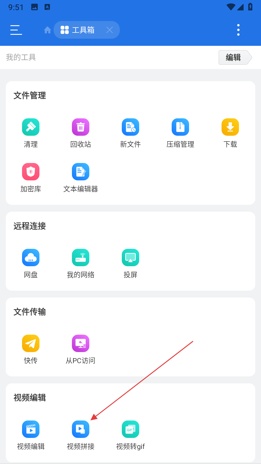 1、開啟ES文件管理器,進(jìn)入全部工具界面,在視頻編輯區(qū)域找到視頻拼接選項并點(diǎn)擊,進(jìn)入視頻選擇環(huán)節(jié)。