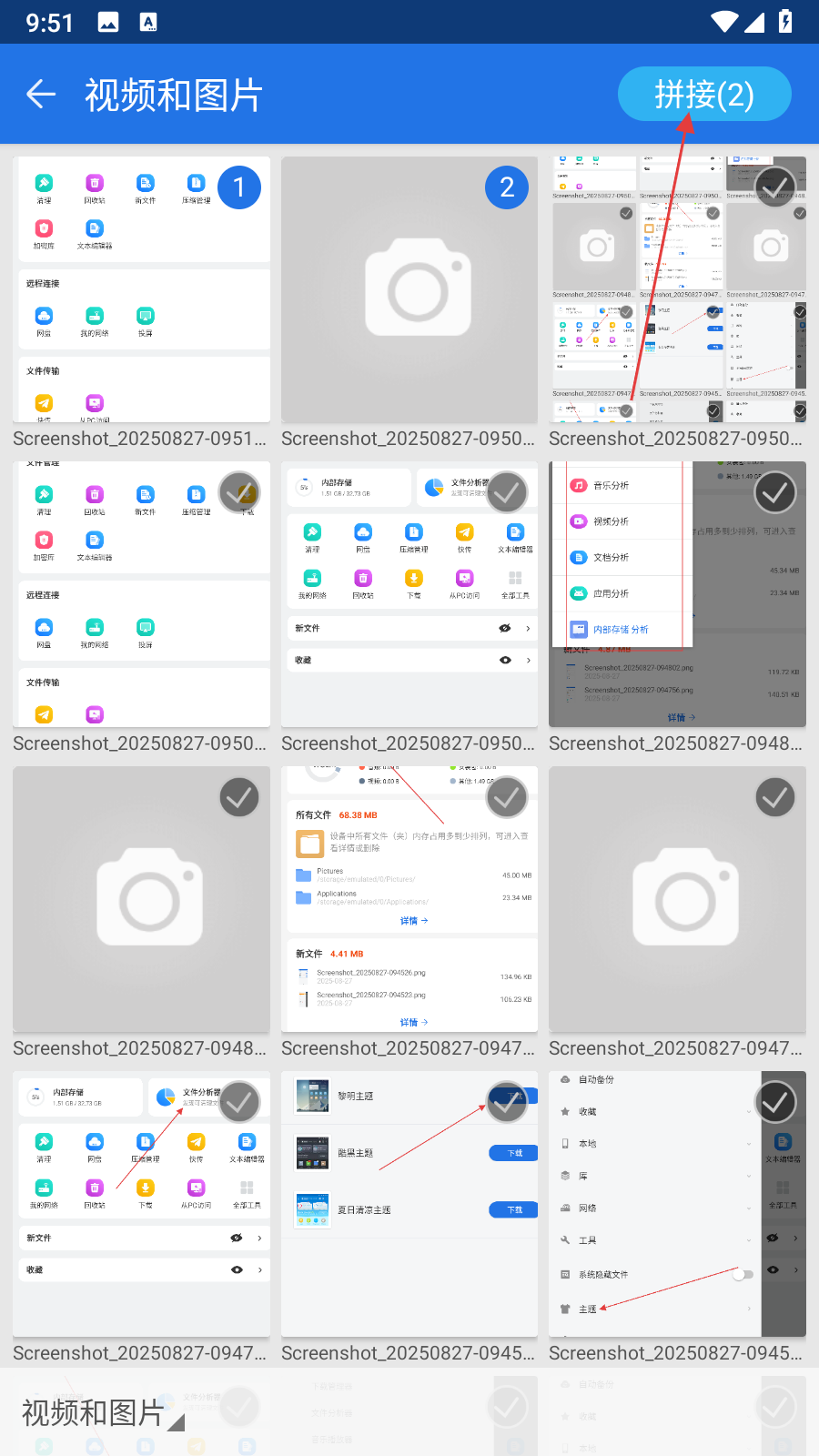 2、在視頻和圖片界面,勾選需拼接的視頻素材,選好后點(diǎn)擊右上角拼接按鈕,跳轉(zhuǎn)至視頻拼接操作頁。