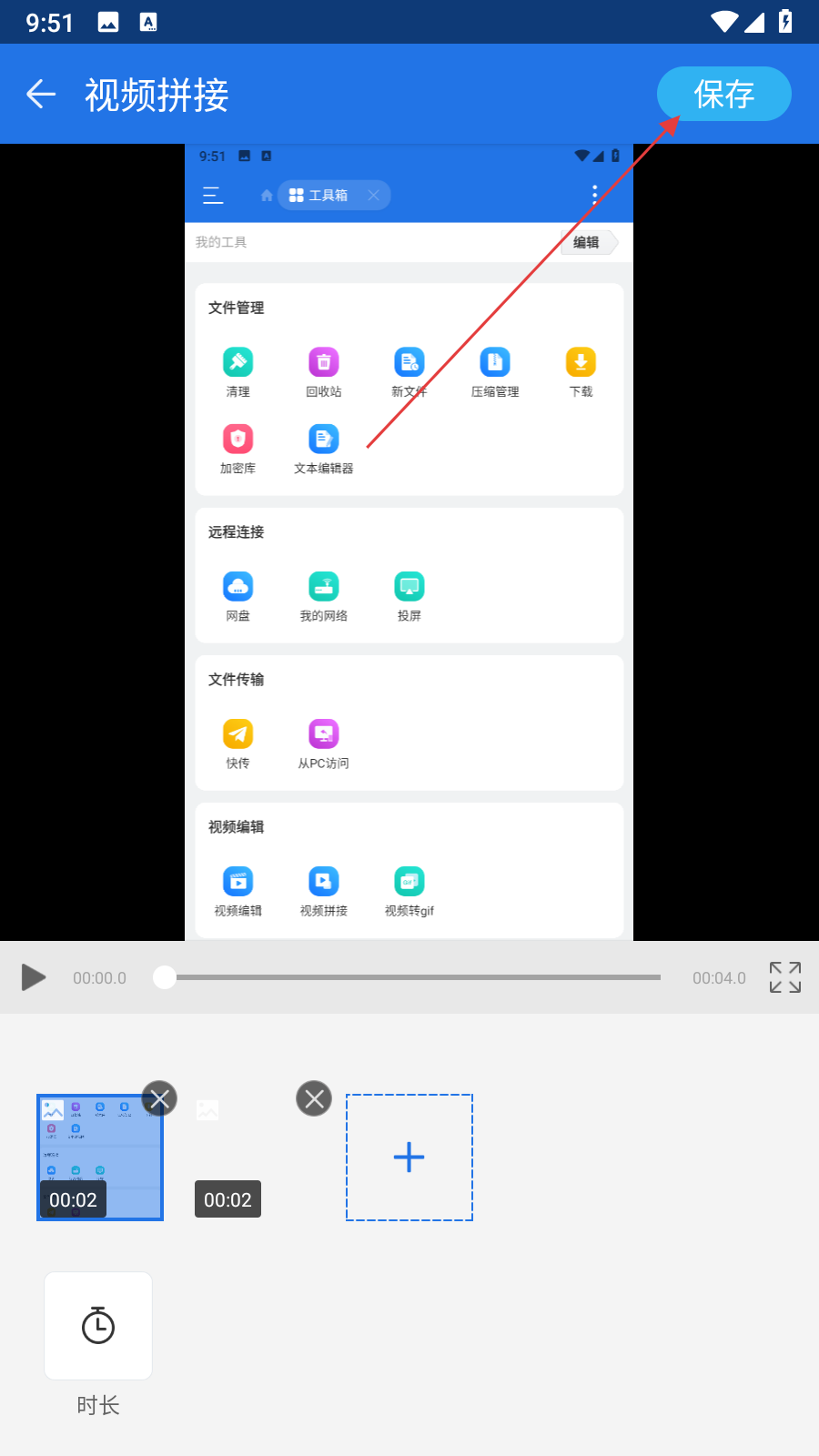 3、于視頻拼接界面,可按需調(diào)整視頻排列順序,確認(rèn)無誤后點(diǎn)擊右上角保存,等待系統(tǒng)完成視頻拼接即可。