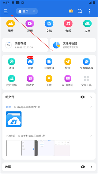 1、打開ES文件瀏覽器,點(diǎn)擊左上角三條橫線圖標(biāo)。