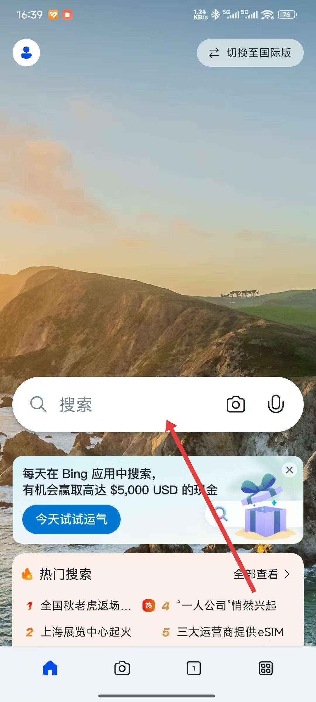 1、打開微軟必應應用,在首頁點擊搜索欄。