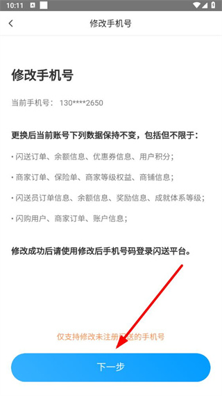 3、在修改手機(jī)號頁面,點(diǎn)擊下一步按鈕,進(jìn)入驗(yàn)證碼輸入頁面。