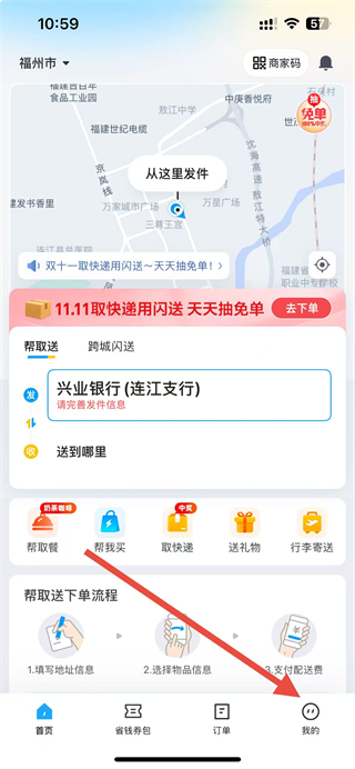 1、在閃送員app首頁點(diǎn)擊我的選項(xiàng),進(jìn)入個(gè)人頁面。