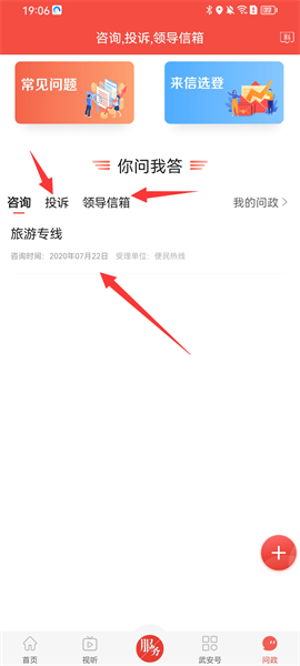 4、在【問(wèn)政】欄目,大家可以在線資訊各種問(wèn)題,也可以進(jìn)行相關(guān)投訴,或者是給領(lǐng)導(dǎo)寫信反映想說(shuō)的問(wèn)題發(fā)送到領(lǐng)導(dǎo)信箱中。