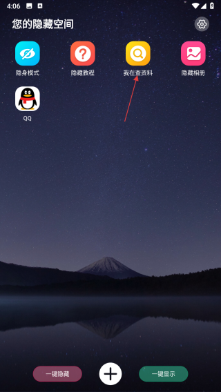 1、打開(kāi)應(yīng)用隱藏雙開(kāi)的隱藏空間界面,點(diǎn)擊我在查資料選項(xiàng),進(jìn)入功能說(shuō)明頁(yè)面。