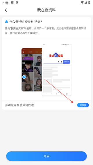 2、在我在查資料頁(yè)面,點(diǎn)擊去授權(quán)按鈕,跳轉(zhuǎn)到顯示在其他應(yīng)用的上層設(shè)置界面。