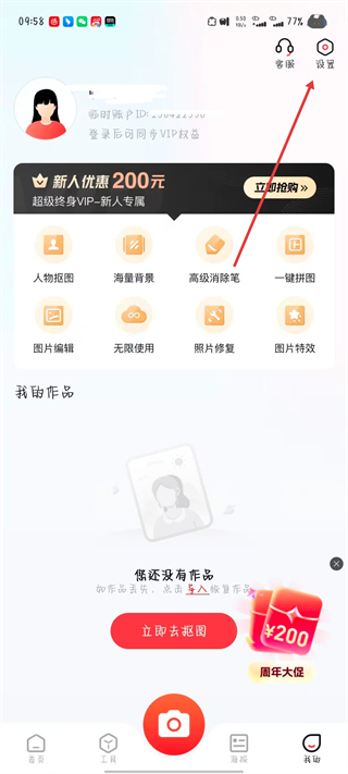 1、打開一鍵摳圖app,在我的頁面,點擊設(shè)置圖標(biāo)。
