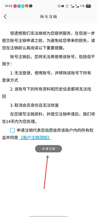 3、勾選《賬戶注銷須知》,然后點擊申請注銷按鈕。