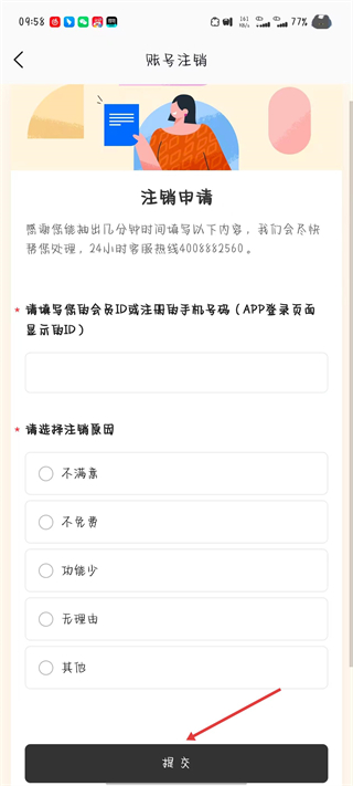 4、填寫會員ID或手機號碼,選擇注銷原因,最后點擊提交。