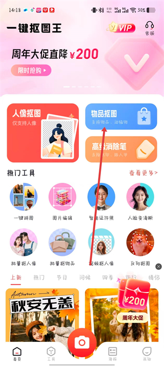 1、打開一鍵摳圖王APP,在首頁點擊物品摳圖選項。