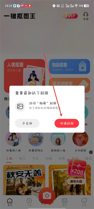 2、彈出權(quán)限申請框后點擊申請權(quán)限,獲取訪問相冊權(quán)限。