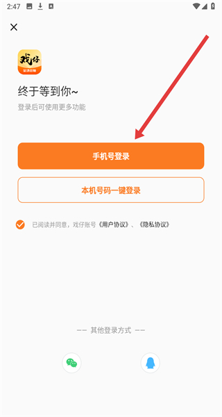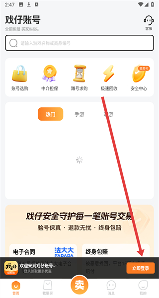 1、在戲仔賬號APP首頁點擊“立即登錄”,進入登錄選擇頁面。