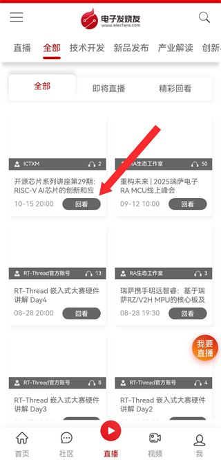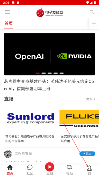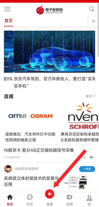 1、打開電子發(fā)燒友app,需要點擊底部直播,進入直播的頁面。