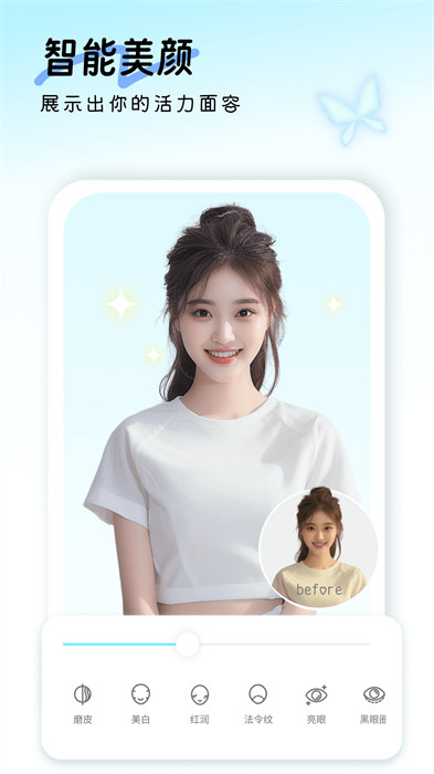 1、一鍵磨皮祛痘,點(diǎn)擊磨皮功能可以自由調(diào)節(jié)磨皮強(qiáng)度并去除粗糙感;