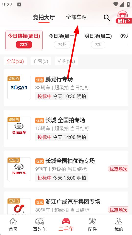 2、進入二手車頁面后,點擊上方的全部車源,瀏覽展示的車源列表。