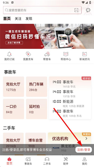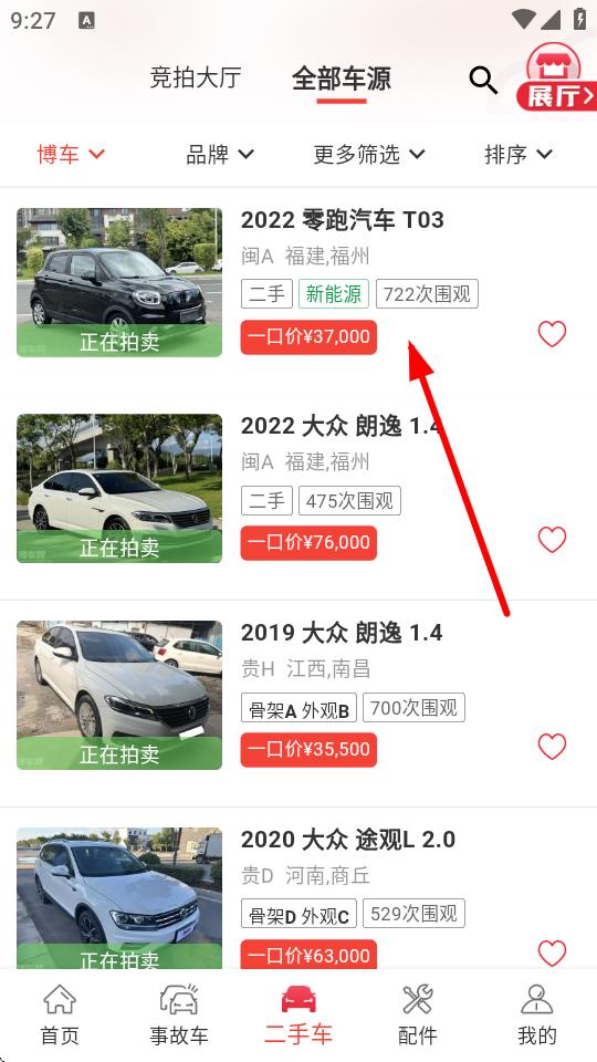 1、打開博車網拍賣應用,點擊底部導航欄中的二手車選項。